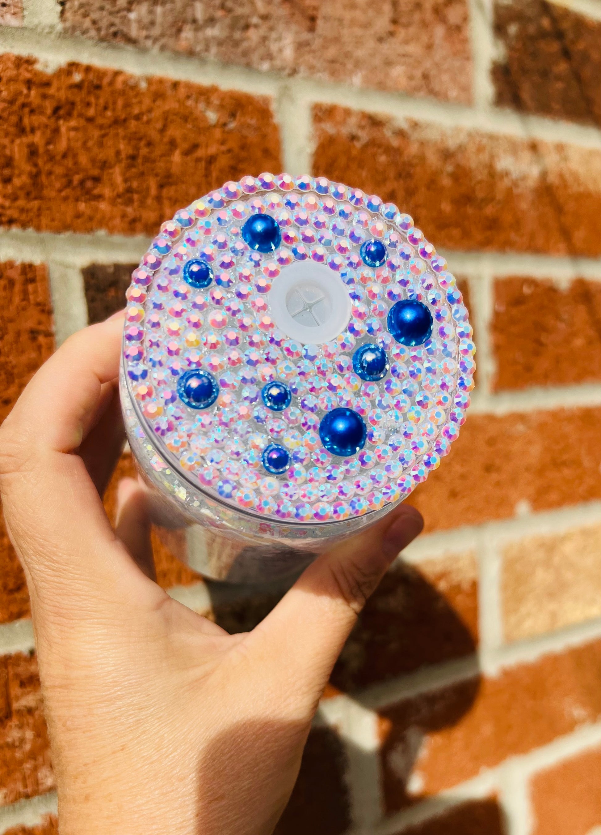 Acrylic double walled glitter globe tumbler with pearl & rhinestones mix lid