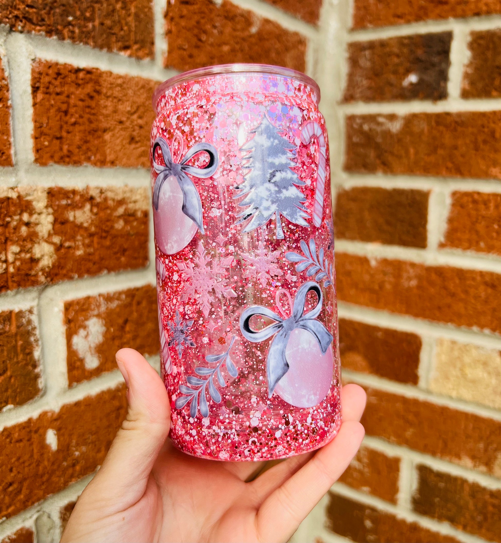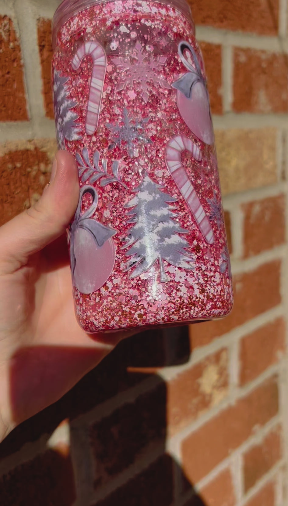 Pink Christmas Acrylic double walled glitter globe with rhinestone & pearl mix lid